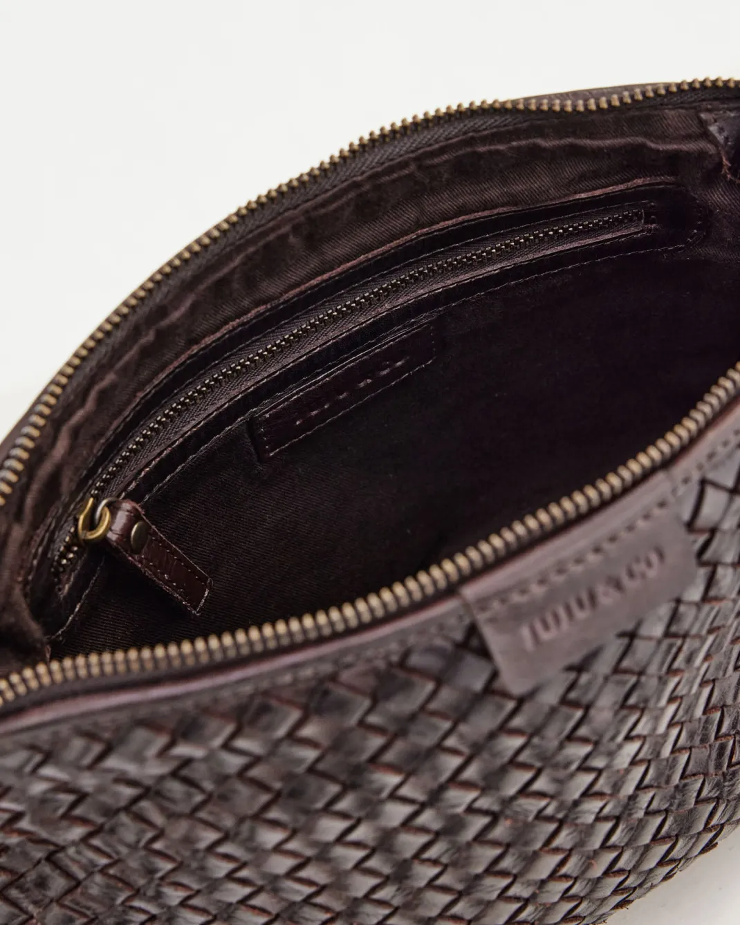 W23cm L16cm D8cmWoven leather designOne detachable and adjustable crossbody strapZipper closureOne internal zip pocketTw…