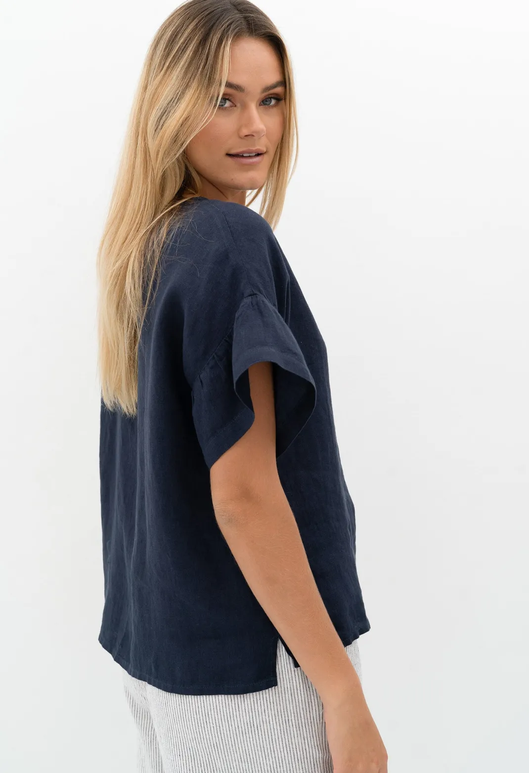 Crafted from 100% French flax linen, this top is ideal for warm summer days and will go with everything. It has a loose fit for comfort and a very slight ruffle sleeve that adds a little something extra. Styled with our gorgeous Empress Necklace.