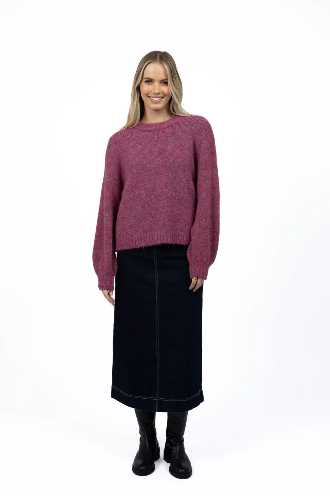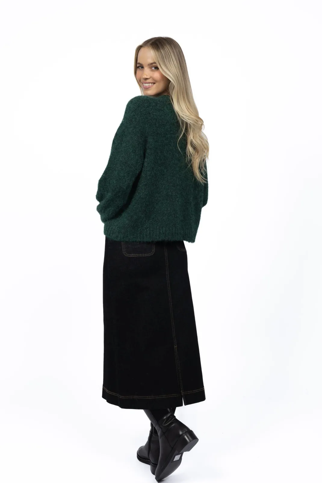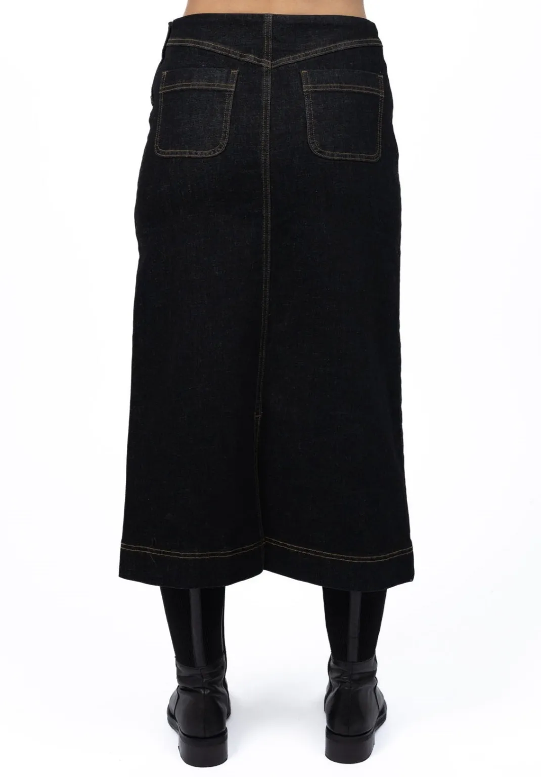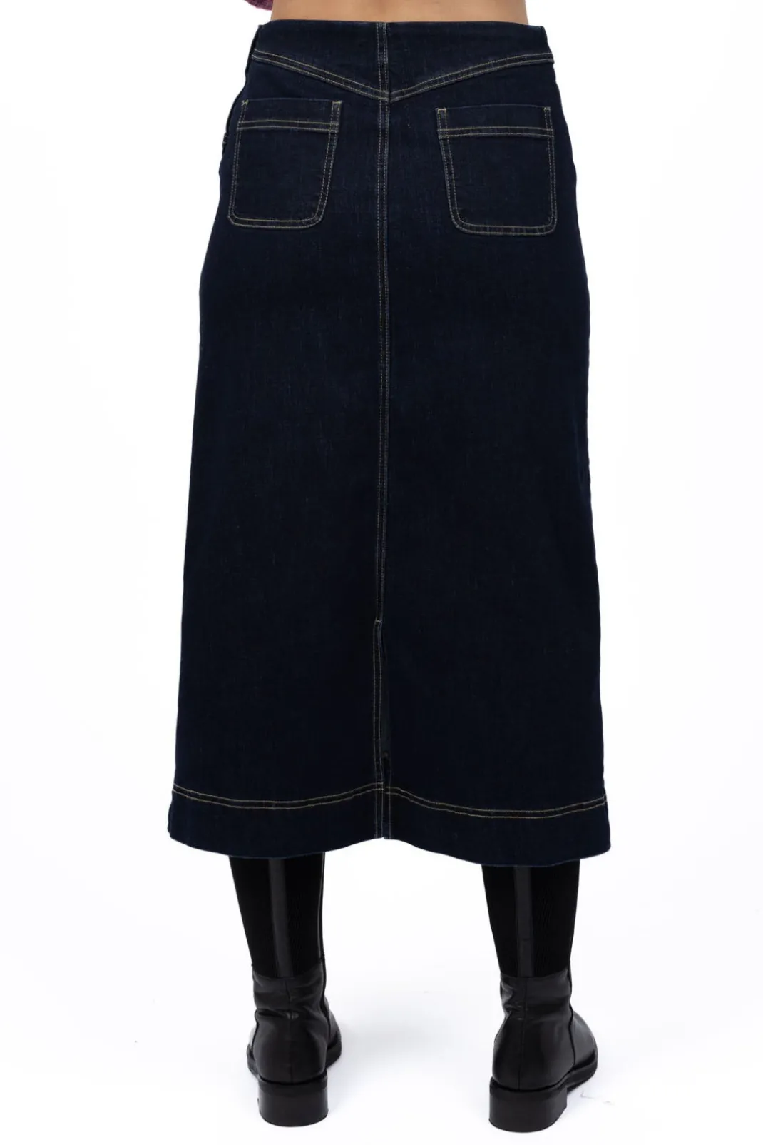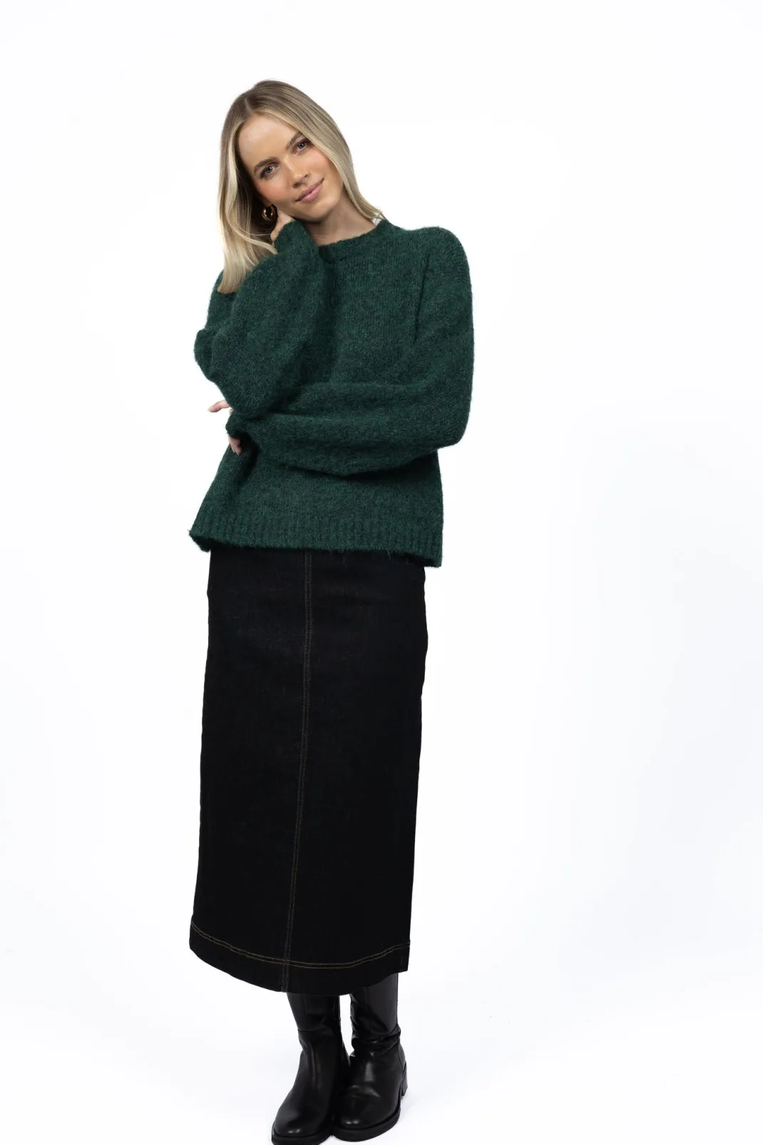 This gorgeous long denim skirt is a great winter staple! With just the right balance of mid-weight denim and comfortable stretch, Nevada molds perfectly to your shape giving a flattering fit. She’s a great base for so many looks year-round – paired here with our Neve jumper.
