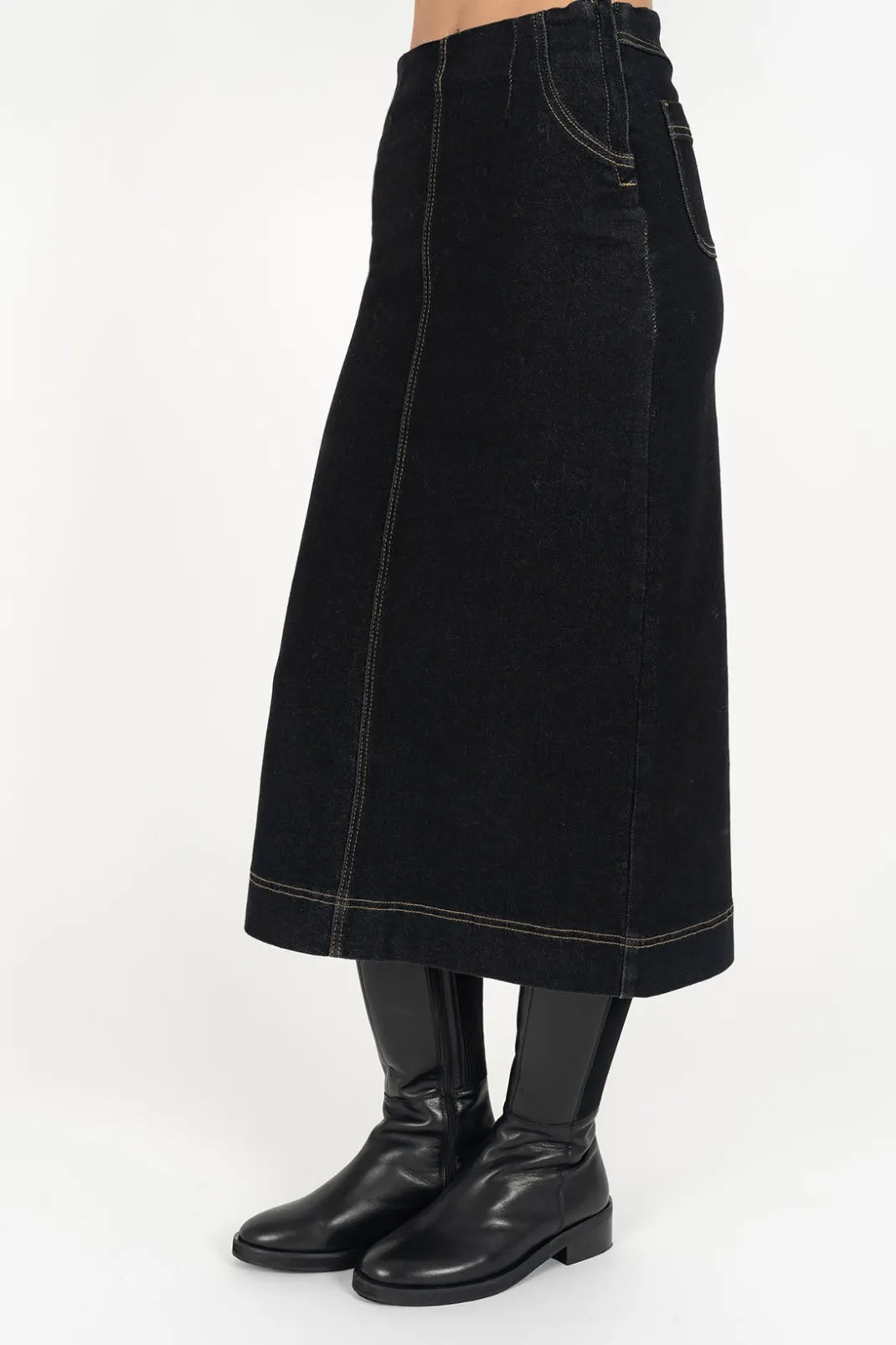 - Classic high-waisted stretch denim skirt.