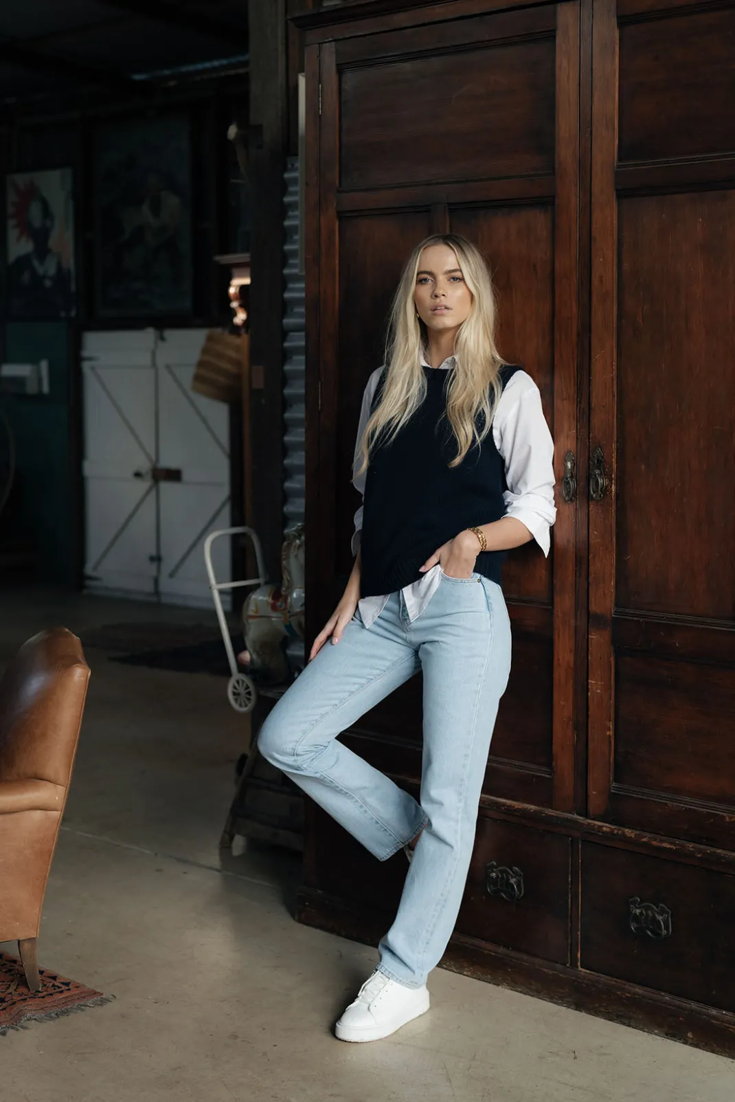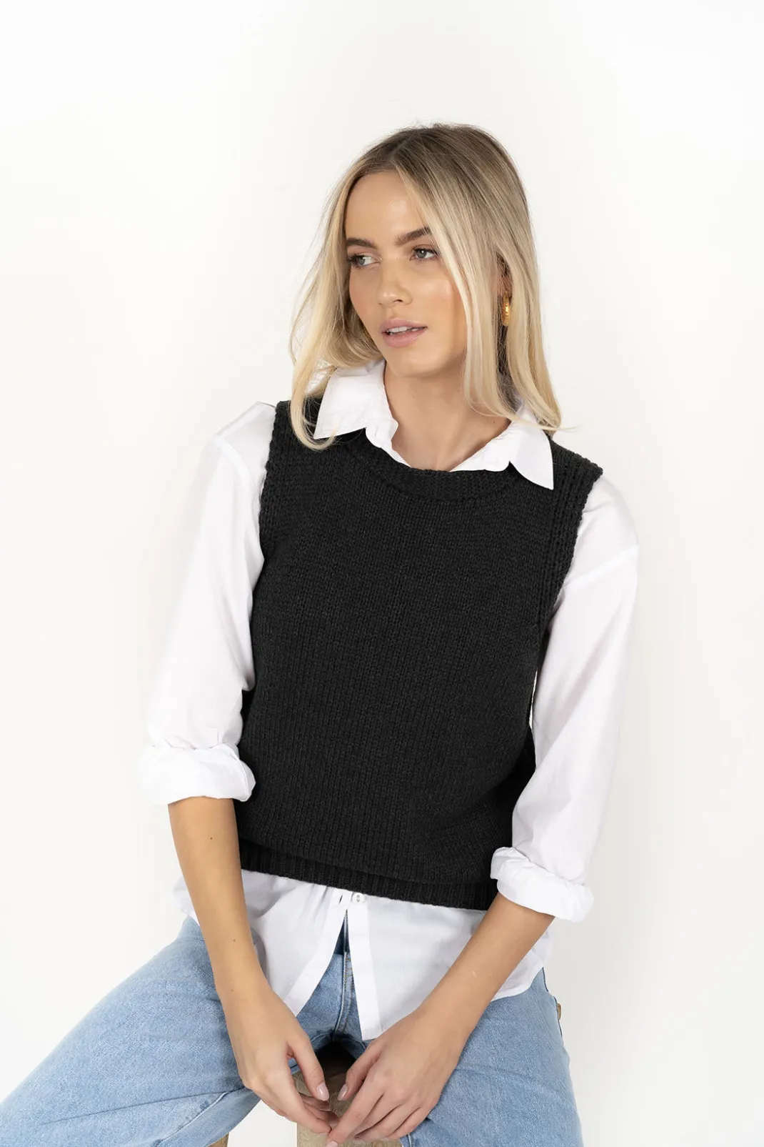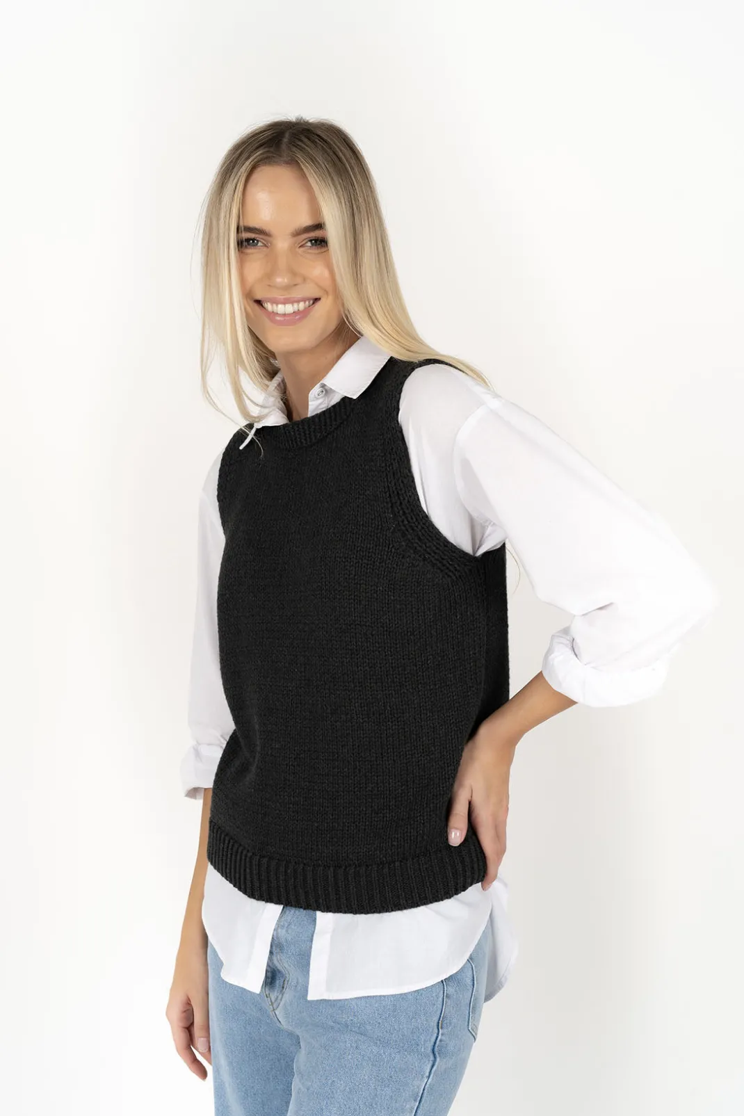 Our Gale vest has been designed with all weather in mind – perfect for layering during the cooler months but also a stylish piece worn on its own. Crafted from 100% mid-weight cotton, this cute knit is super comfy and breathable whilst keeping you cozy and warm where you need it most. She teams perfectly with our Stephanie Shirt as seen here. Cotton fibres tend to be very low pilling, she will be low maintenance, and you will get years of wear out of this piece.