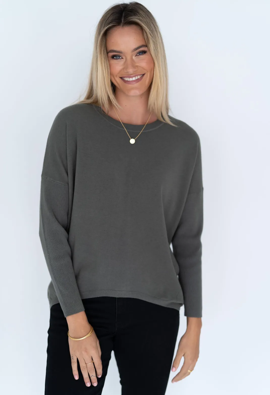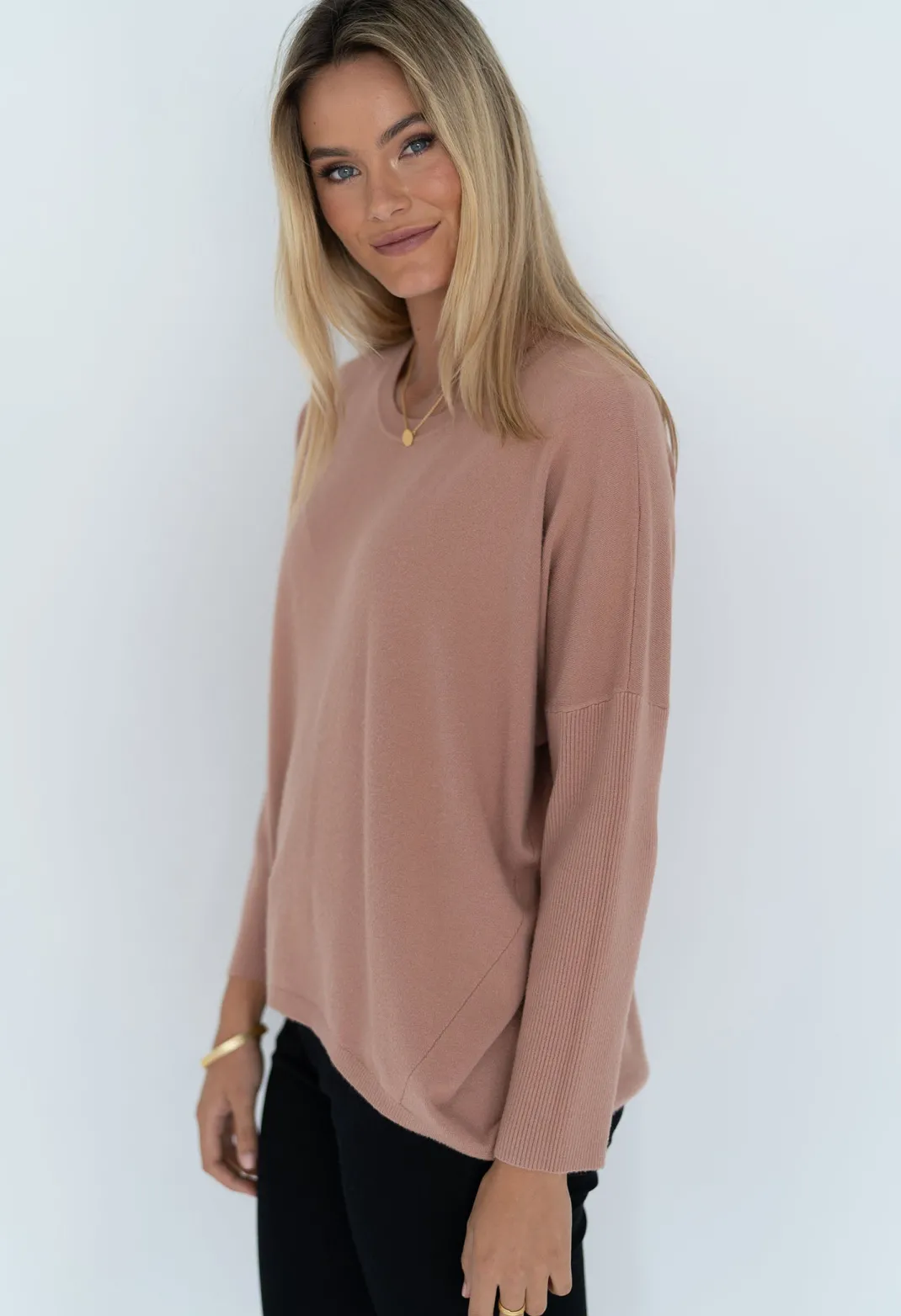 - Casual drop shoulder jumper with scooped hem