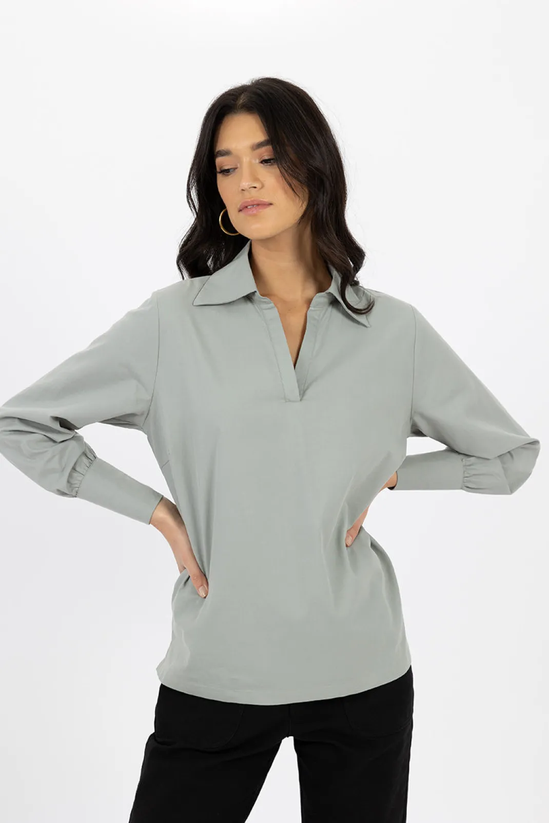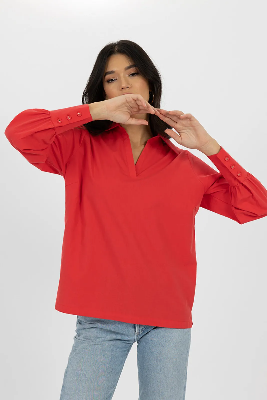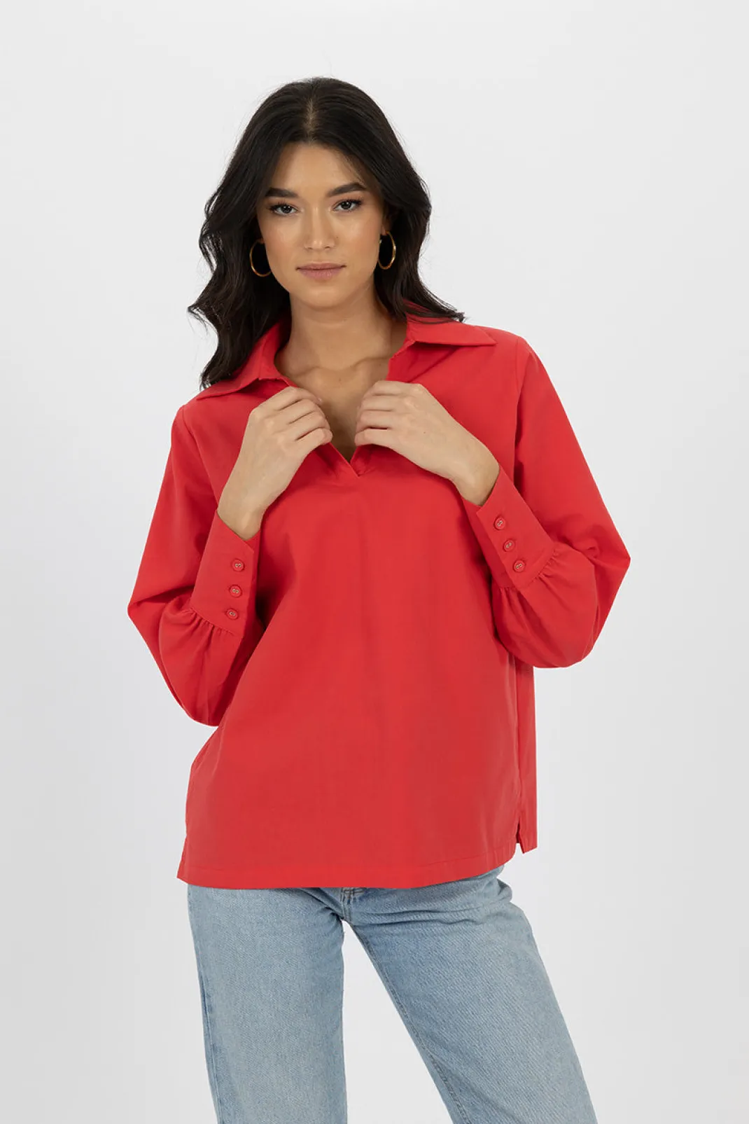 Introducing the classic Simmy Top. A timeless garment that combines style and comfort. This shirt-style blouse offers a touch of sophistication and the V-neck is super flattering . The structured design, versatility and roomy fit makes this an easy piece to style for work or play.