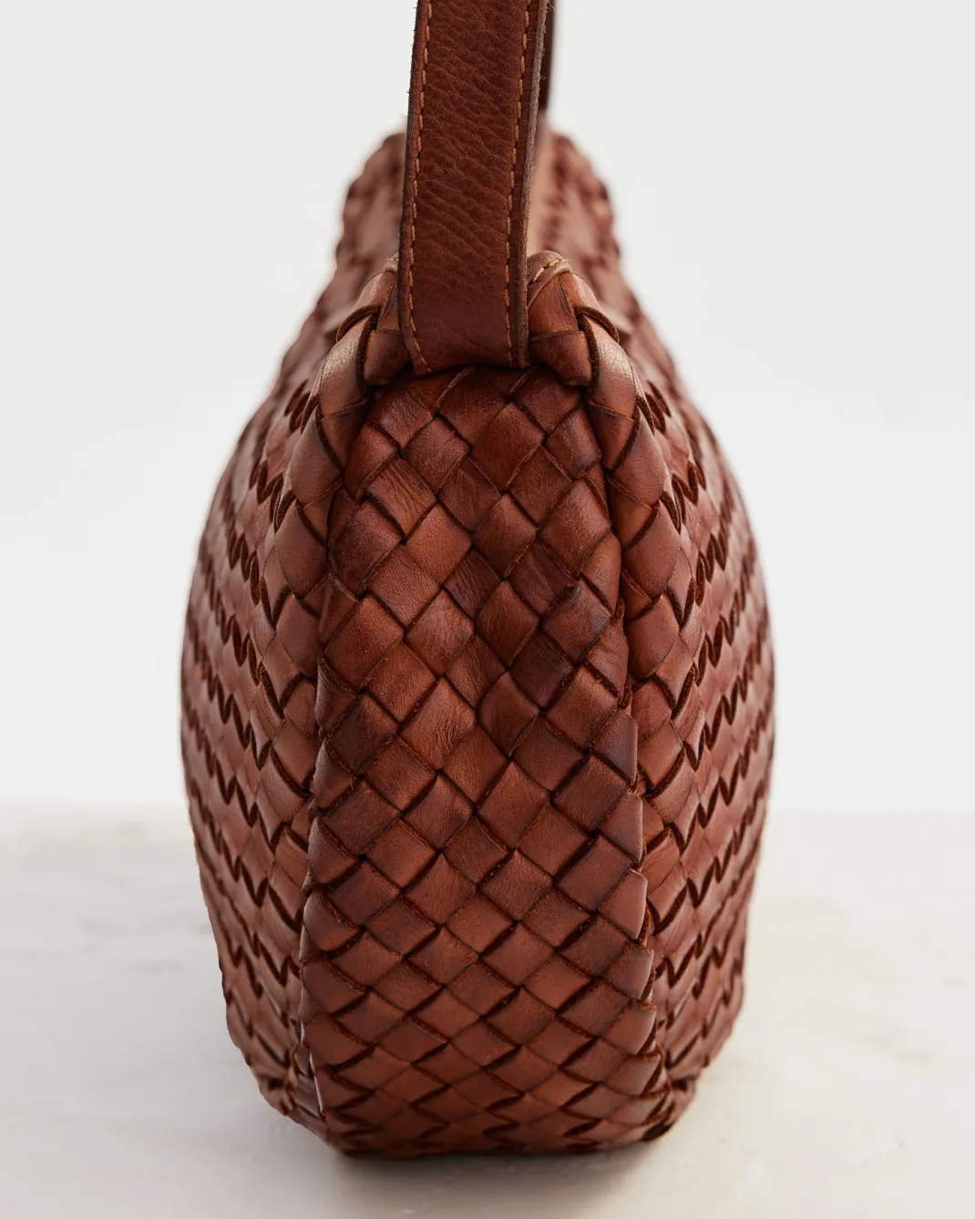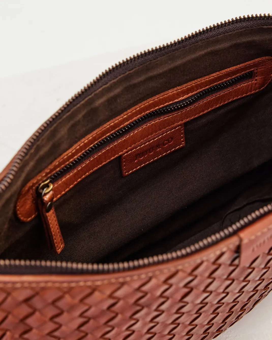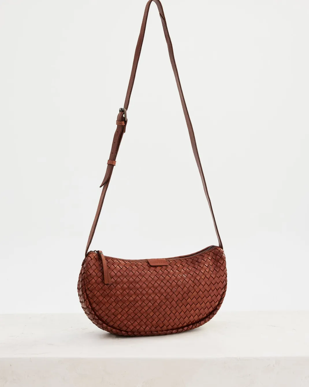 W28cm L19cm D7cmWoven leather designNon-removable and adjustable belt crossbody strapZipper closureOne internal zip pock…