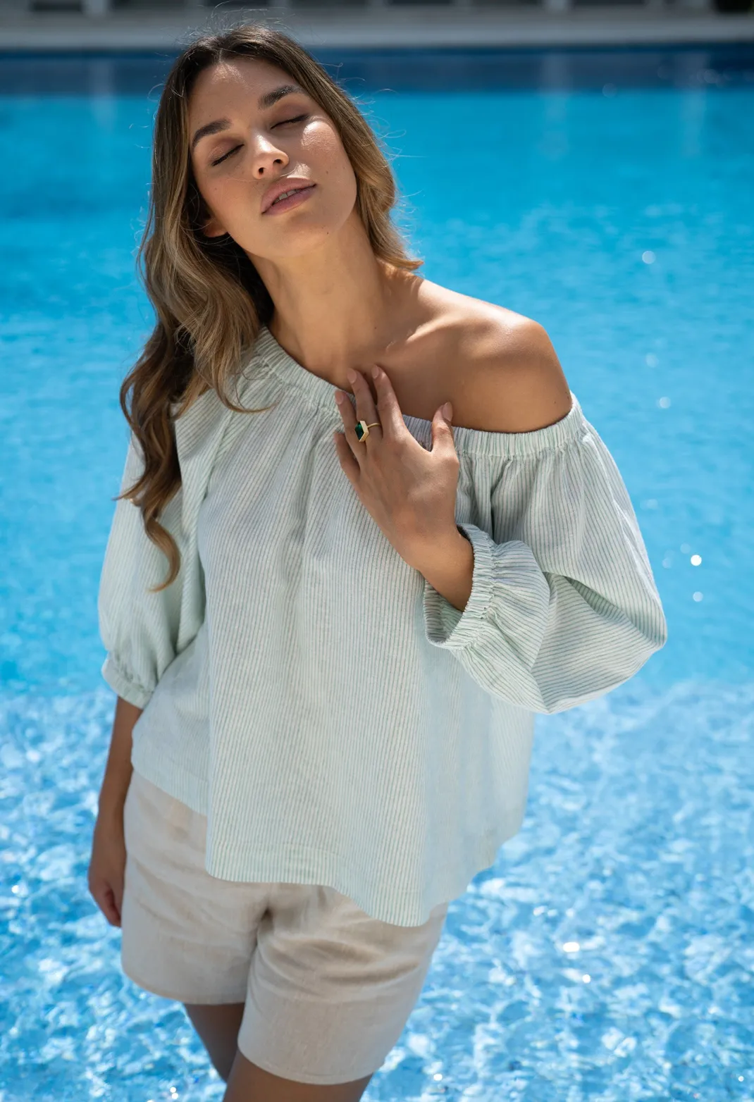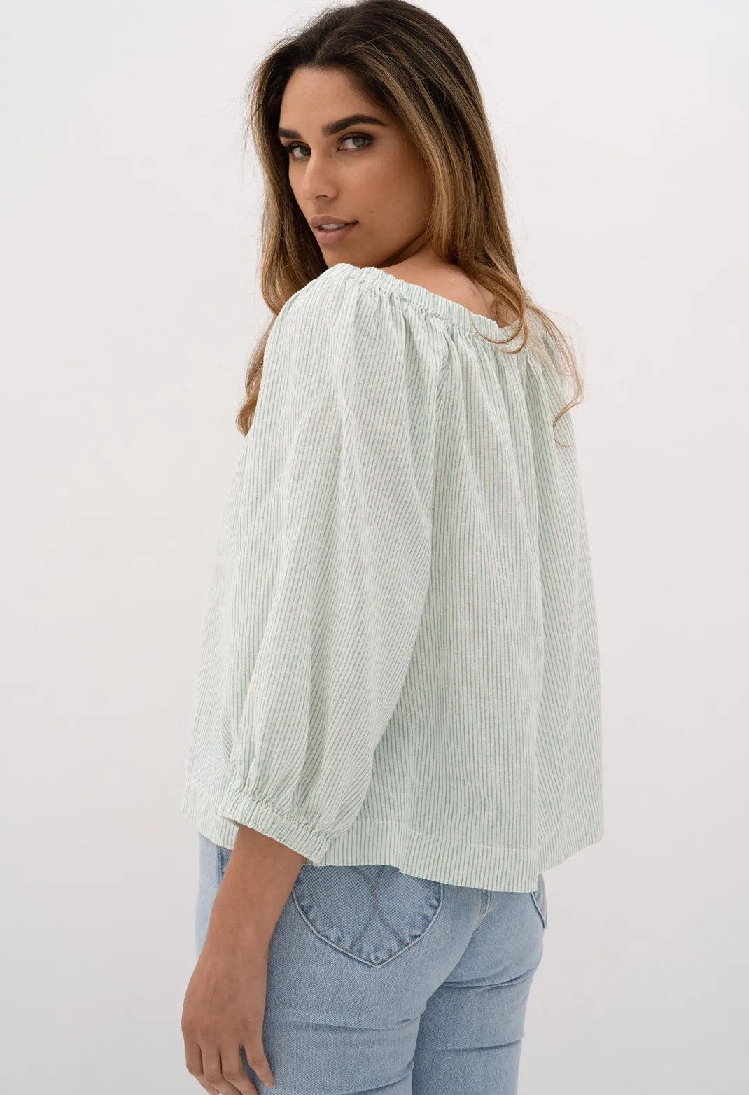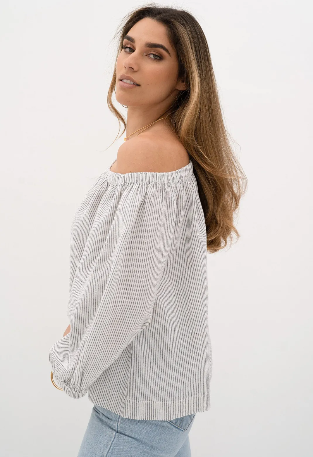 This breezy, lightweight blouse is a perfect trans-seasonal piece. Created in a self-striped linen /cotton blend. We love it on or off the shoulder. An easy-wear loose fitting piece with a relaxed, timeless feel. Team her perfectly with our Phoebe Shorts and Empire Ring.