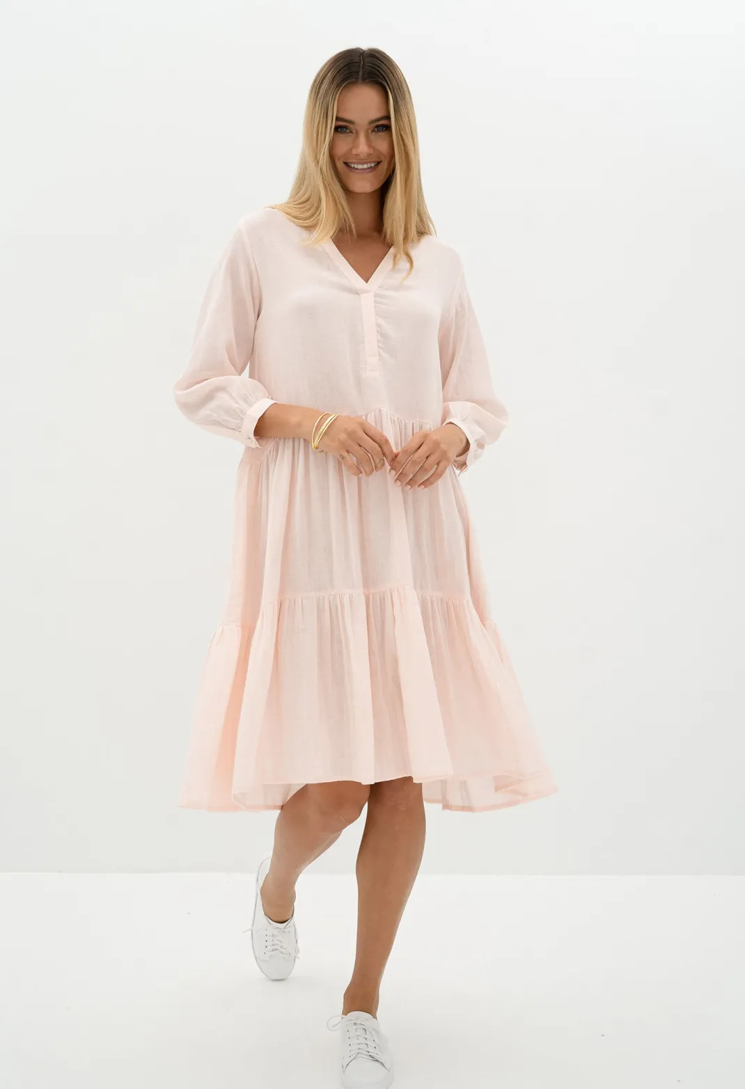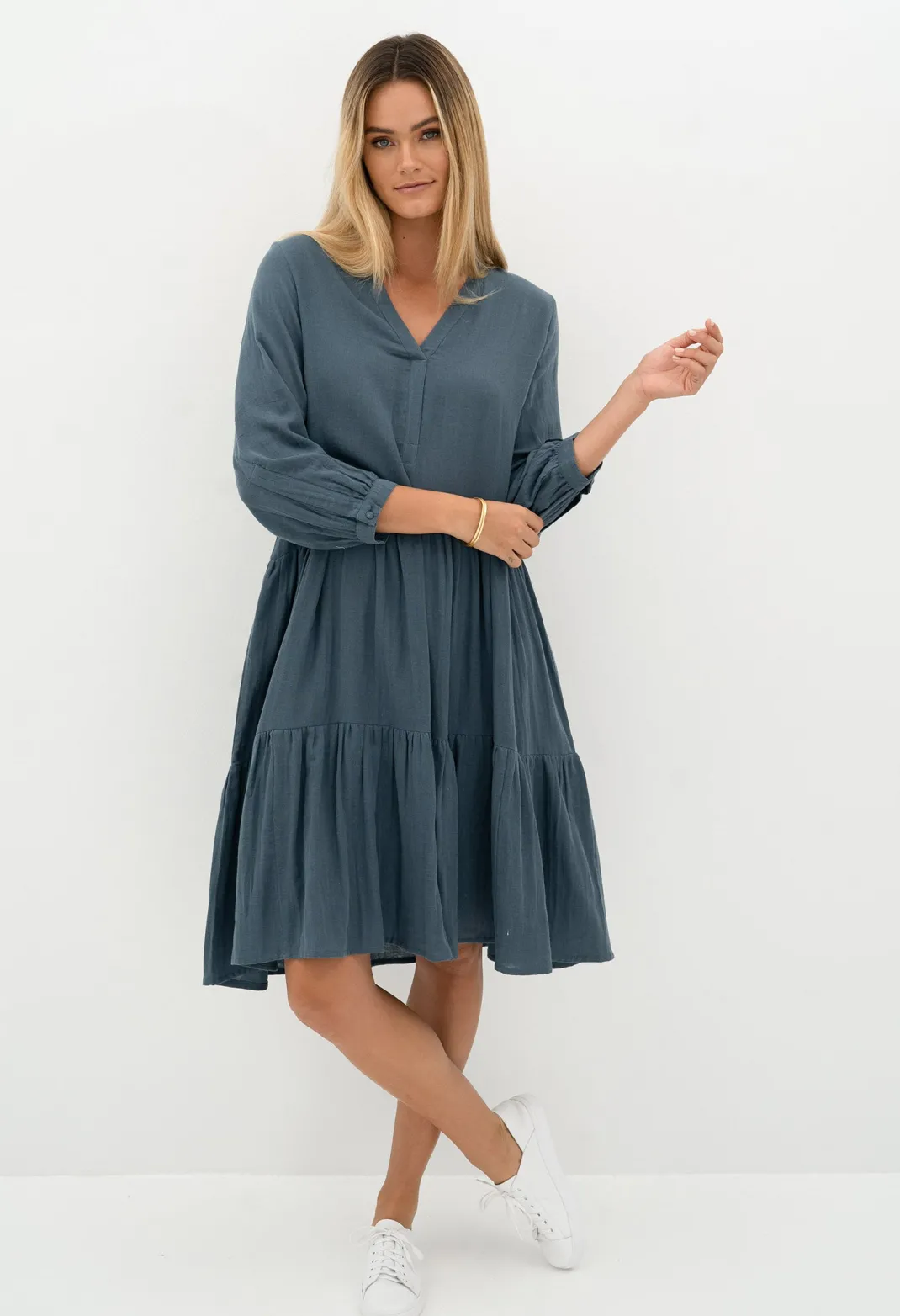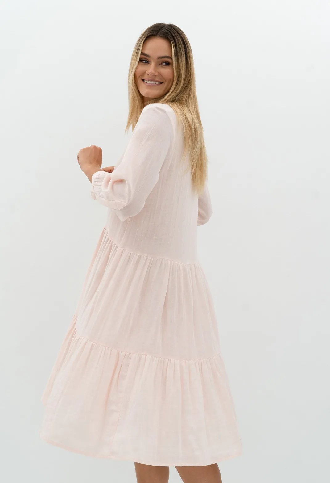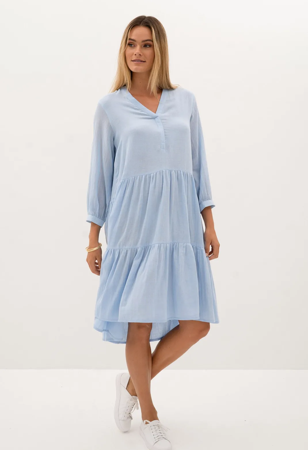 The gorgeous summer dress can take you from a stroll on the sand, to dinner in the city. Featuring a v-neck, long, loose fitting sleeves and floaty, skirt panels. Created in a soft 100% cotton gauze, that will keep you cool and comfortable all summer. Perfectly teamed with slides or pair with sneakers for a fun weekend look. Available in three colours.