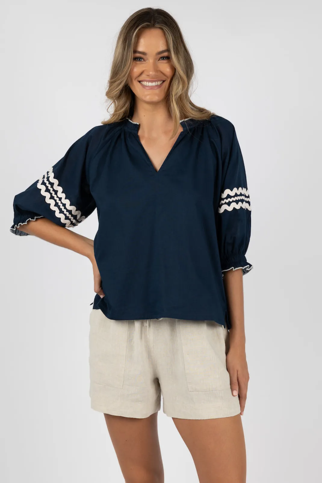- Soft cotton blouse with stunning Zig-Zag cotton feature trim.